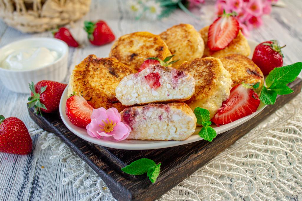 Любителям блюд из творога предлагаю приготовить сырники с клубникой. Для этого рецепта подойдут как свежие, так и замороженные ягоды. На мой взгляд, сочетание творога и клубники - идеальное! Приготовить такие сырники достаточно просто. Получаются они очень вкусными, с аппетитными кусочками сочной и ароматной клубники. К столу подавайте их со сметаной, мёдом, йогуртом или сгущёнкой.