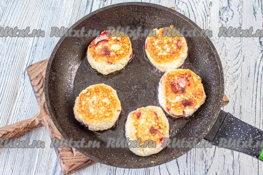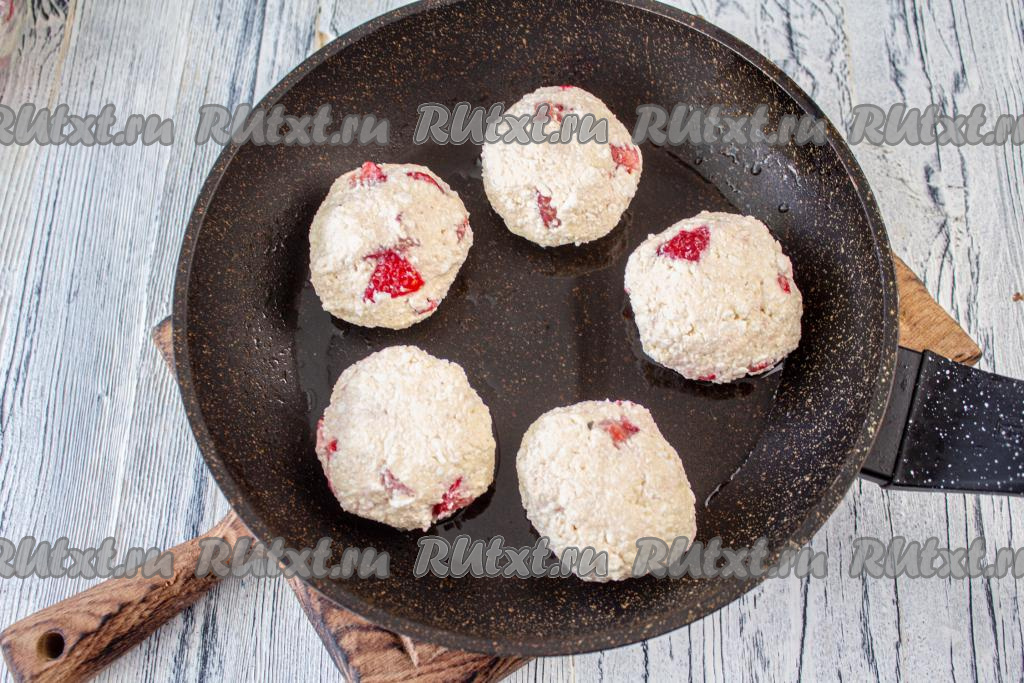 В сковороду влейте растительное масло и хорошо разогрейте. Из творожной массы сформируйте шарики, выложите их на сковороду, слегка приплюсните и жарьте под крышкой в течение 3-4 минут при слабом нагреве.
