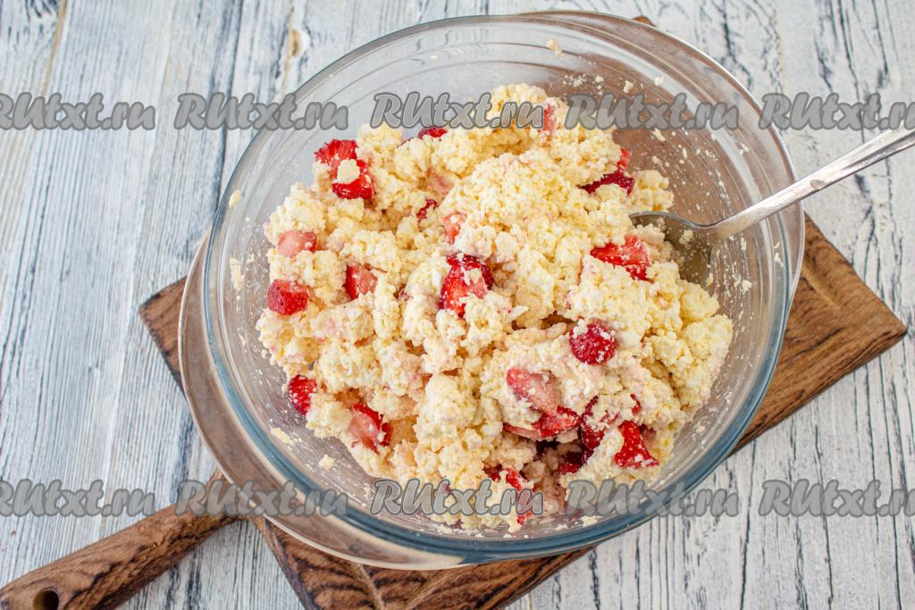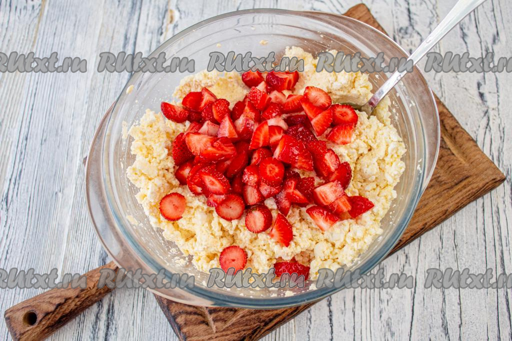 Аккуратно, стараясь не мять кусочки ягод, перемешайте клубнику с творожной массой.