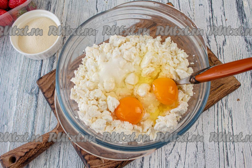 В достаточно объёмную миску выложите творог, добавьте сахар и куриные яйца, перемешайте массу вилкой до однородности.