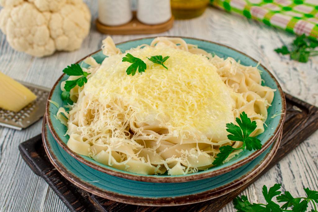 Подать блюдо можно по-разному. Можно при подаче соединить соус из цветной капусты с отваренными макаронами, перемешать и присыпать сыром. А можно подать, как я, - выложить на тарелку макароны, сверху - соус из цветной капусты и присыпать сыром. И сразу подавать, дополнив, по желанию, салатом из свежих овощей.