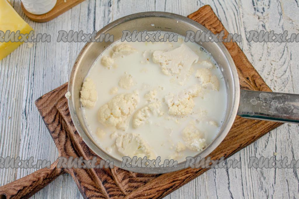 В подходящий ковш влейте молоко, посолите по вкусу и доведите до кипения. Опустите в кипящее молоко соцветия свежей (или замороженной) цветной капусты и после закипания варите на минимальном огне 10-15 минут (до мягкости капусты).