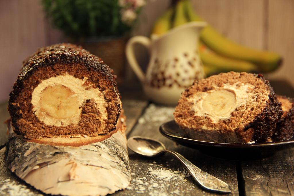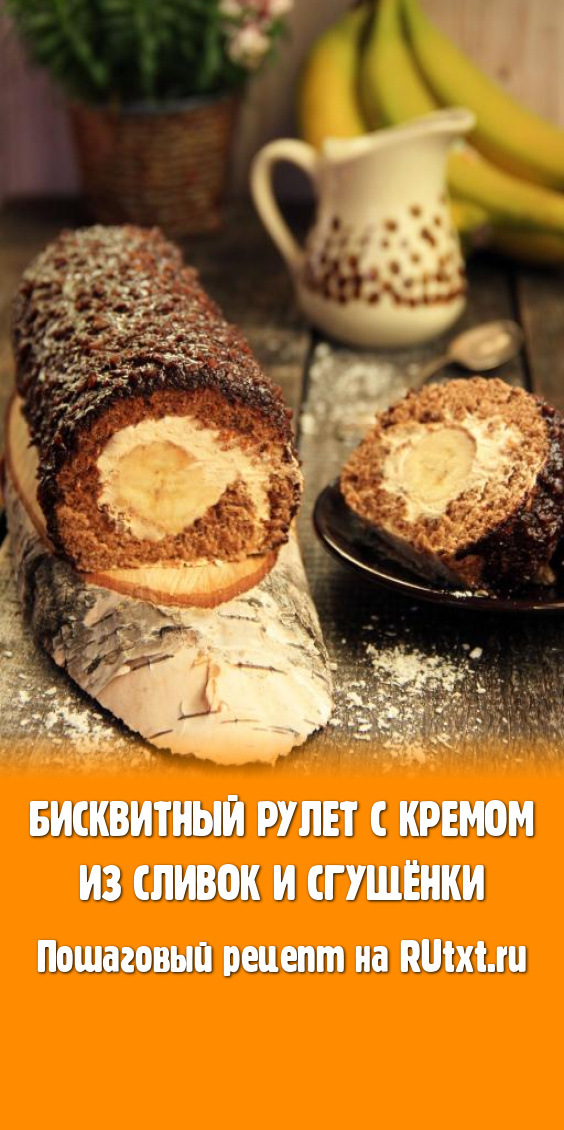 Для домашнего чаепития можно приготовить вкусный, нежный, ароматный бисквитный рулет с кремом из сливок и сгущёнки. В качестве основы испечём шоколадный бисквит. А в качестве начинки будем использовать взбитые сливки и варёную сгущёнку. Для того чтобы разрез рулета выглядел более эффектно, в начинку можно добавить очищенные бананы, выкладывая их практически целиком. Впрочем, можно приготовить этот рулетик и без бананов. Верх бисквита можно покрыть растопленным шоколадом, сахарной пудрой, шоколадной глазурью. Рецепт несложный, а бисквитный рулет неизменно получается удачным!