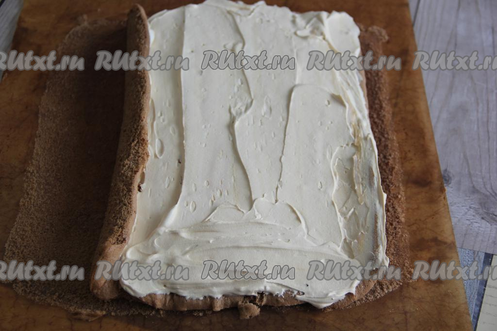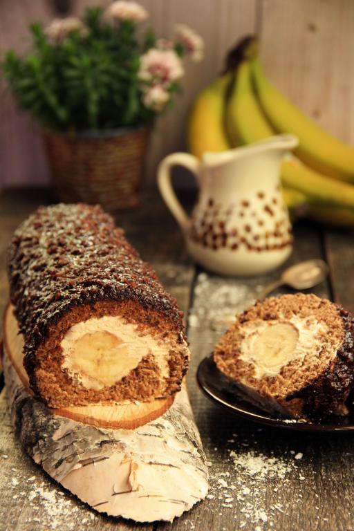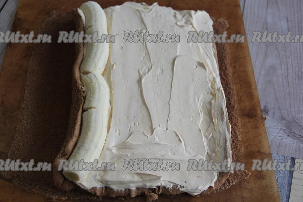 2 банана очистить, отрезать с двух сторон узкие части. Выложить бананы на край широкой стороны бисквитного коржа.