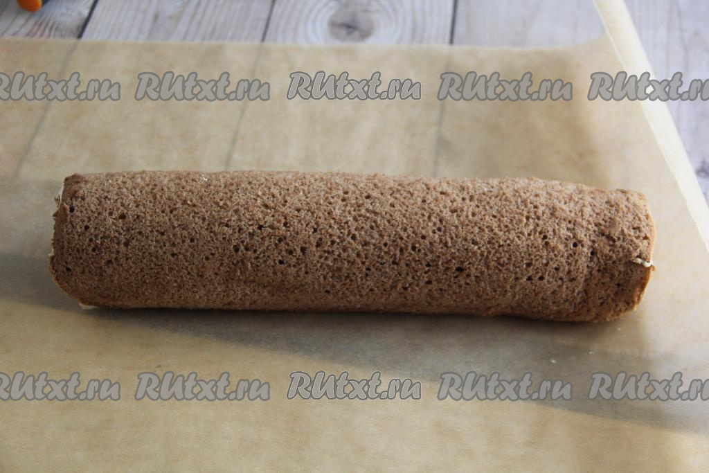 Завернуть бисквит с кремом, начиная со стороны с бананом, в рулет. Завернуть рулет в пергамент и убрать в холодильник на ночь.