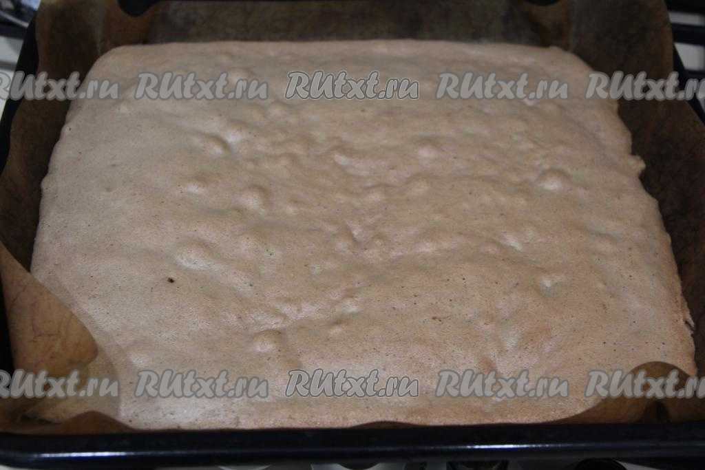 Противень (у меня размер противня 30 на 30 сантиметров) выстелить пергаментом, затем выложить бисквитное тесто и аккуратно разровнять лопаткой.