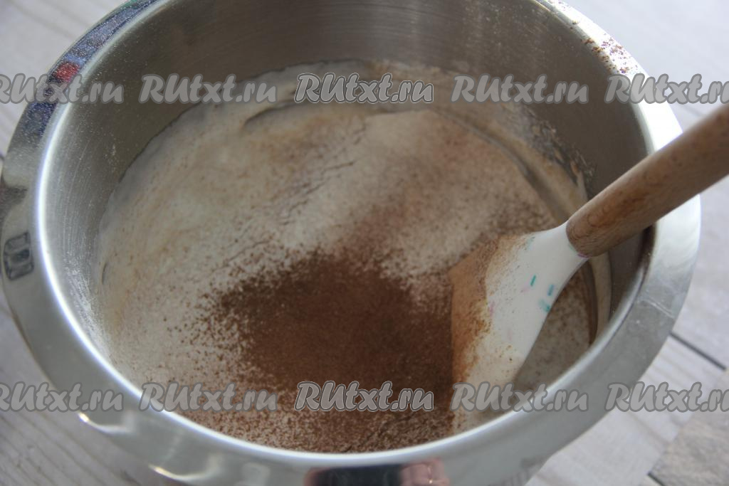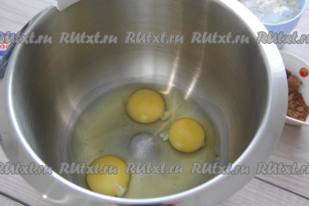 Затем, не прекращая взбивать, тонкой струйкой всыпать сахар, взбивать яичную массу минут 7 (до пышного и светлого состояния). Добавить какао, разрыхлитель, частями всыпать просеянную муку, перемешивая тесто движениями сверху вниз с помощью лопатки.