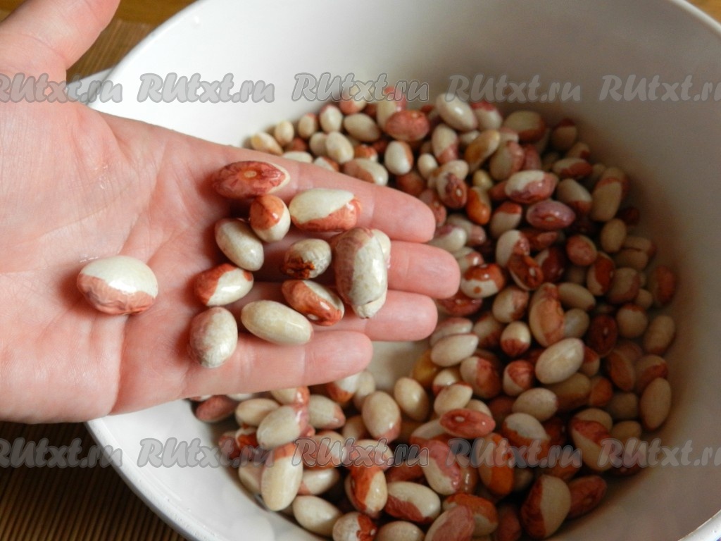 Фасоль промыть, залить холодной водой и оставить на несколько часов или на ночь. Воду слить, фасоль снова промыть, залить холодной водой и поставить варить. Варить фасоль, в зависимости от сорта, примерно один час. Воду слить, но не выливать.