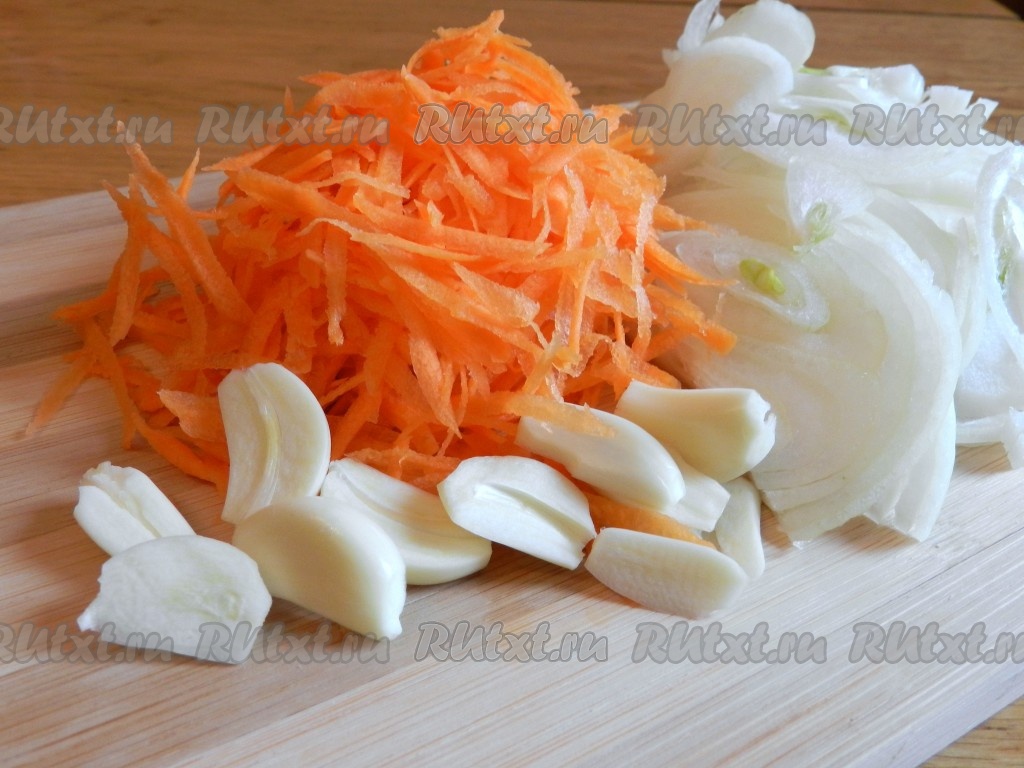 Лук нарезать, морковь натереть на терке, чеснок нарезать соломкой.