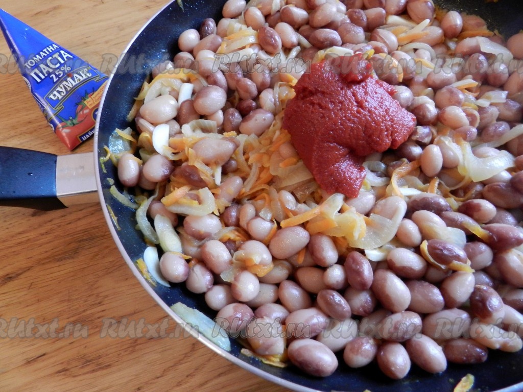 На растительном масле обжарить лук и морковь, добавить фасоль, затем чеснок и томатную пасту. Добавить соль и специи. Разбавить водой от варки фасоли и потушить минуты три все вместе.