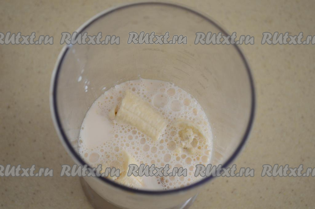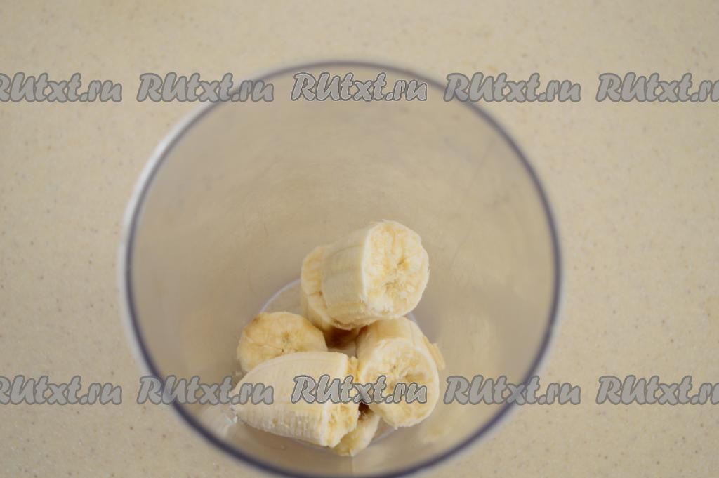 Банан очистить от кожуры, поломать на кусочки и отправить в чашу блендера (или в любую другую узкую и высокую ёмкость, например, в литровую банку).