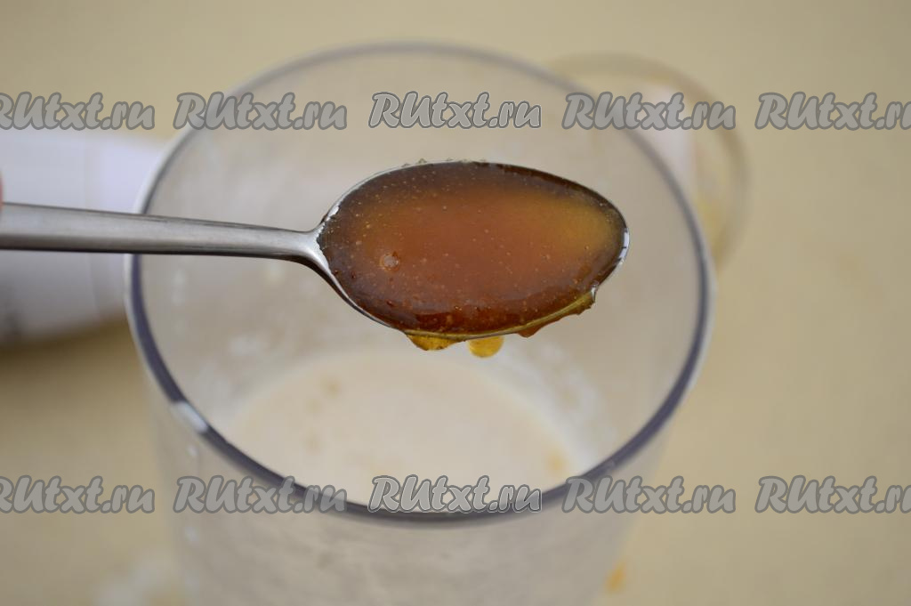 Теперь можно попробовать смузи на вкус. Если банан спелый, то, возможно, ничего больше добавлять не понадобится. Если же вам кажется, что сладости в банановом смузи недостаточно, значит добавьте мёд, сахар или варенье. Я добавила мёд. Взбить смузи погружным блендером.