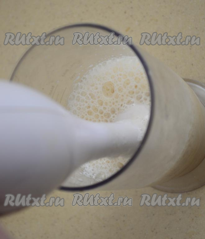 Взбить молоко с кусочками банана погружным блендером до однородности на высокой скорости (на взбивание понадобится не более 1 минуты).