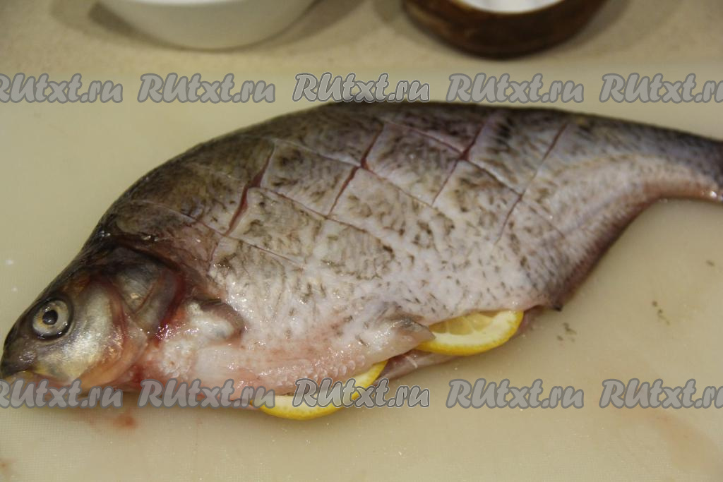 Счистить с леща чешую, затем из брюшка удалить внутренности, отрезать плавники и хвост, промыть рыбку под проточной водой и обсушить её бумажным полотенцем. На поверхности рыбы острым ножом сделать надрезы крест-накрест. Лещ - рыбка достаточно костлявая. Надрезы необходимы, чтобы мелкие косточки успели хорошо пропечься в духовке. Натереть леща солью снаружи и внутри. Вложить в брюшко пару долек лимона.