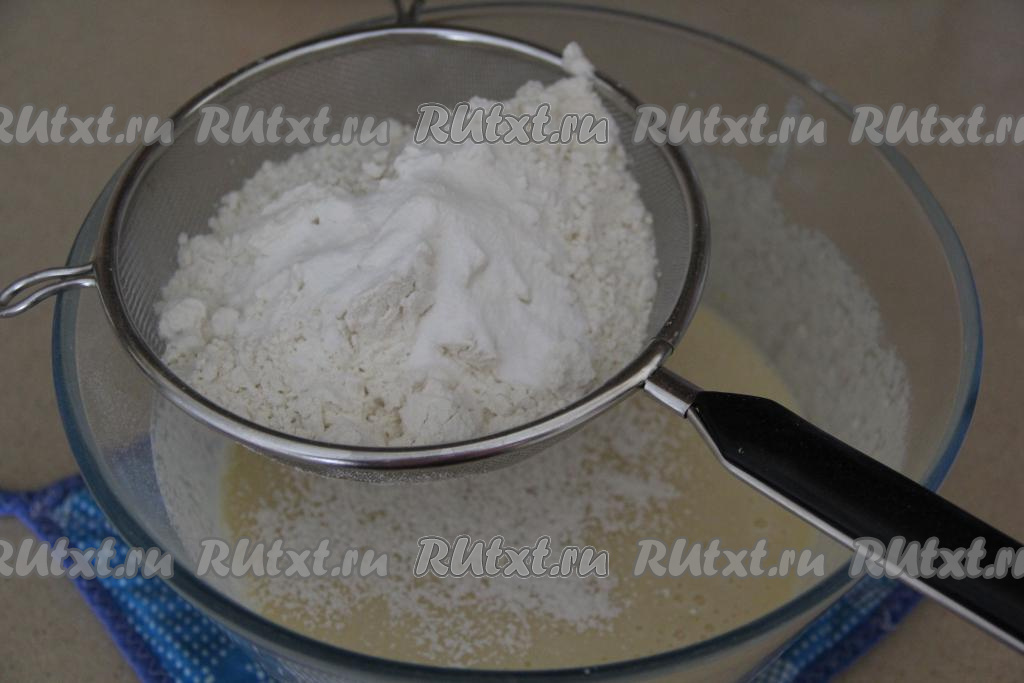 В получившуюся смесь просеять муку, разрыхлитель и соль.
