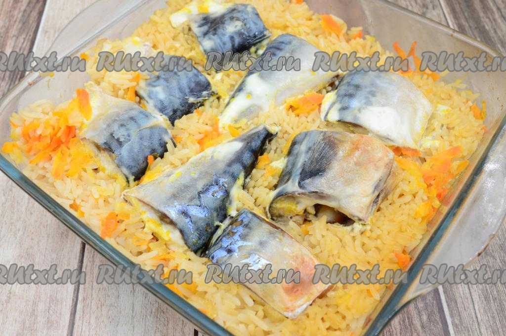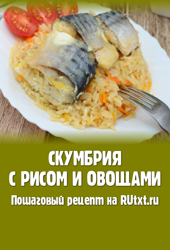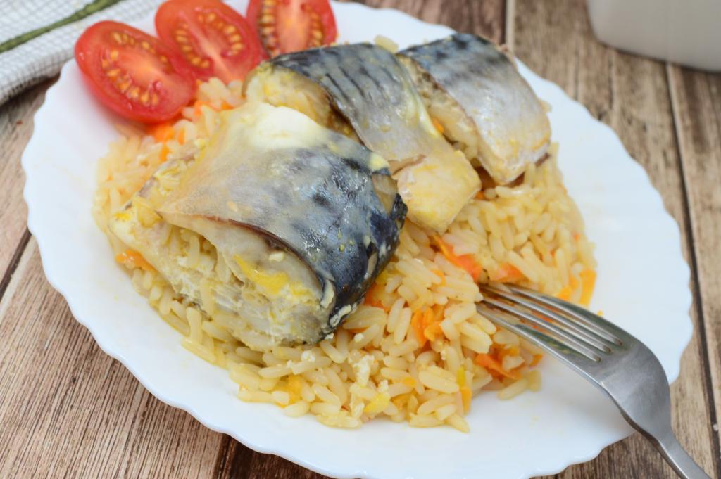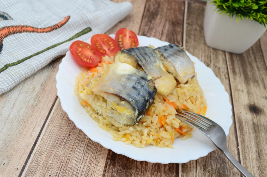 Рис получается хорошо пропаренным, рассыпчатым, овощи делают его особенно вкусным, а скумбрия, благодаря предварительному маринованию в сметане, становится сочной и вкусной. Блюдо подаём к столу горячим, дополнив свежими или солёными овощами.