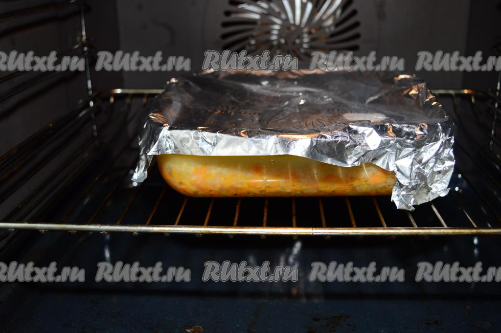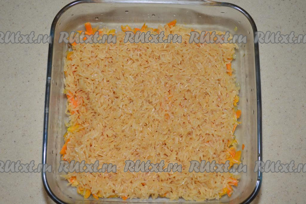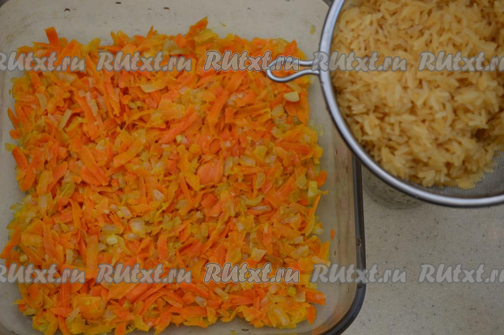 Готовность блюда определяйте по рису - рисинки должны стать мягкими, рассыпчатыми. Достаньте форму с готовым блюдом из духовки.