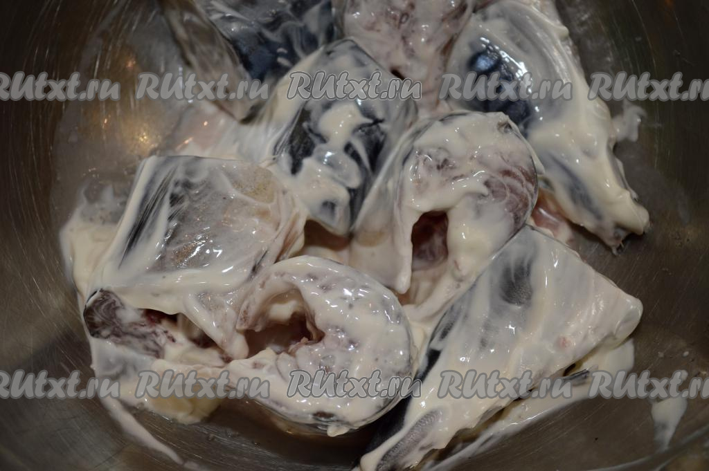Кусочки скумбрии посолите, поперчите, смажьте сметаной со всех сторон и отправьте промариноваться в холодильник на время, пока занимаетесь подготовкой остальных составляющих этого блюда.