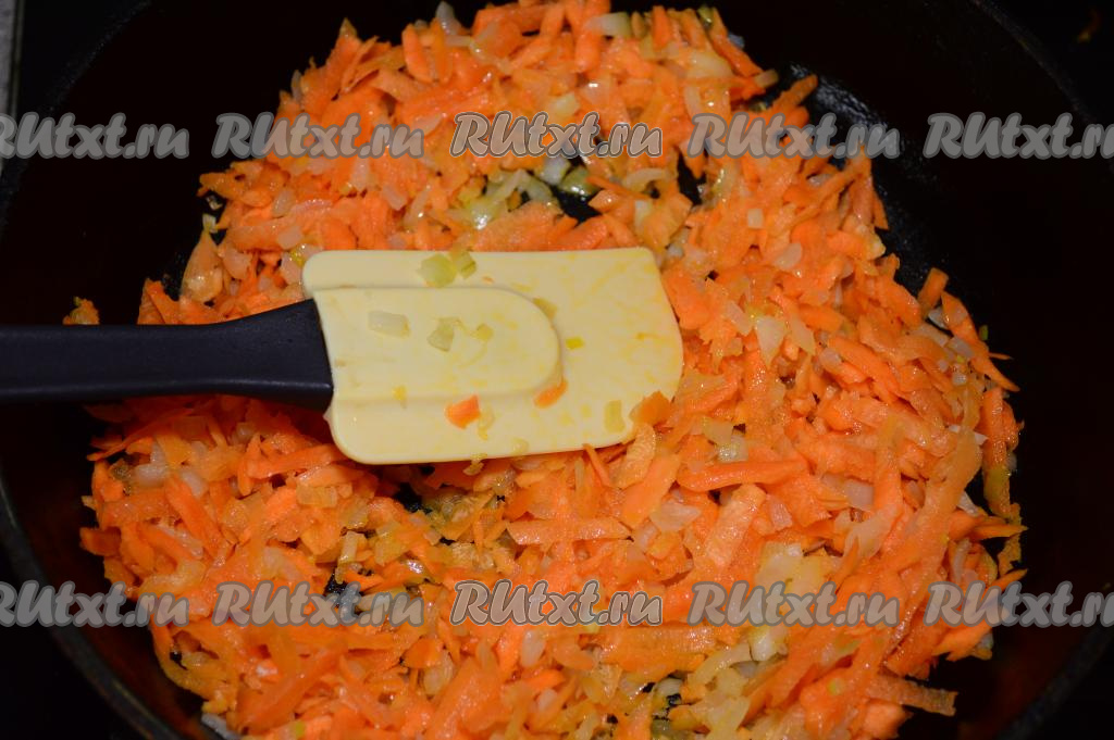 Морковку очистите и натрите на крупной тёрке. Добавьте морковку к луку и обжаривайте, периодически помешивая, ещё 6-7 минут (до мягкости моркови). Если морковка суховата, можно добавить в процессе обжаривания 1-2 столовых ложки воды.
