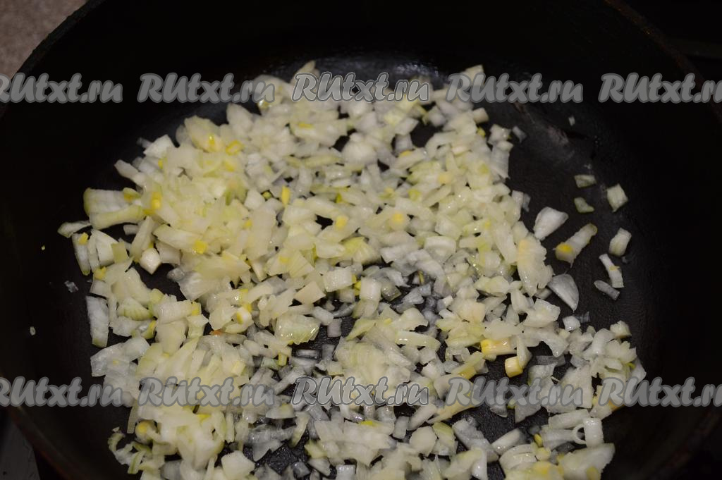 С лука удалите шелуху, промойте и нарежьте его мелко. Отправьте лук обжариваться на сковороду с растительным маслом. Обжаривайте на среднем огне, помешивая, минуты 3-4 (до прозрачности).