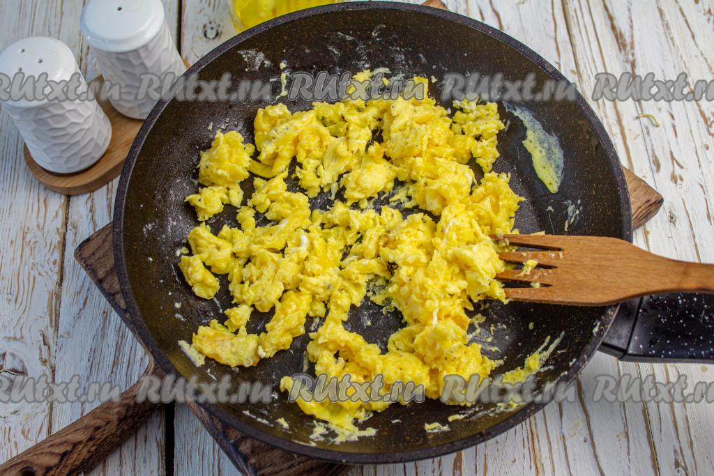 В сковороде растопите сливочное (или разогрейте растительное) масло, влейте яйца и, быстро перемешивая лопаткой, обжарьте яйца, чтобы получились яичные хлопья.