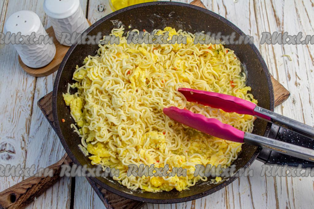 С запаренной лапши слейте лишнюю жидкость, а саму лапшу выложите в сковороду к яйцам и вместе прогрейте 1-2 минуты, помешивая.