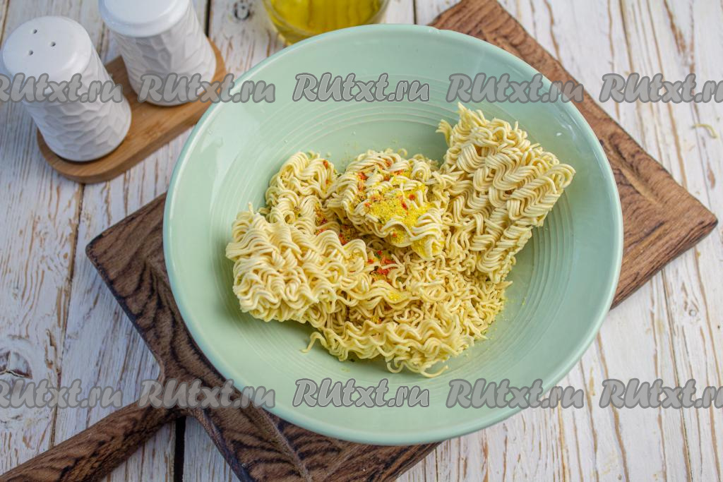 В подходящую глубокую посуду выложите лапшу и добавьте специи. Я добавила специи по типу кубика от Галины Бланки в рассыпчатом виде, но можно использовать те специи, которые идут в упаковке с лапшой "Доширак".