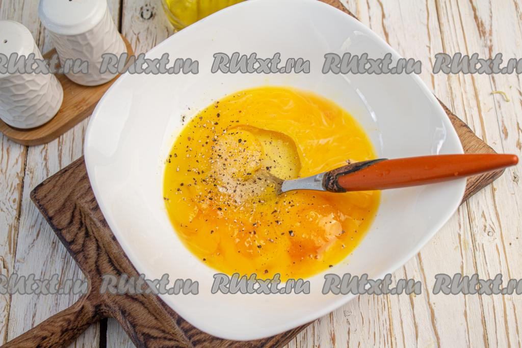Пока запаривается лапша, в отдельную миску вбейте сырые яйца, посолите, поперчите их по вкусу и размешайте вилкой.