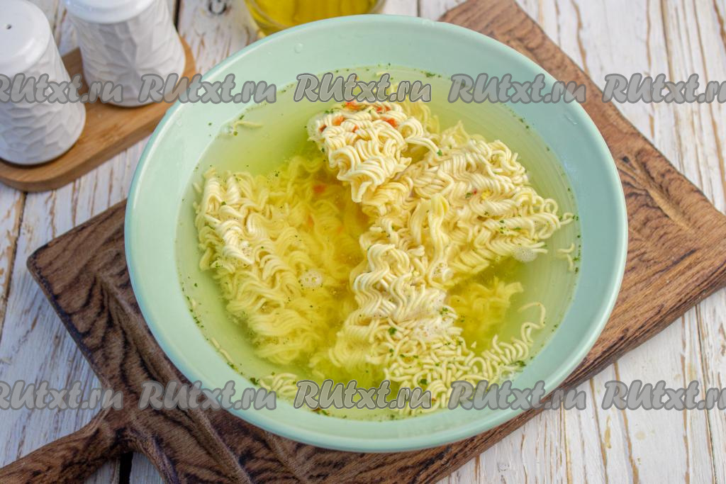 Залейте лапшу со специями крутым кипятком так, чтобы вода полностью покрыла лапшу. Накройте сверху тарелкой и оставьте запариться минут на 5-7.