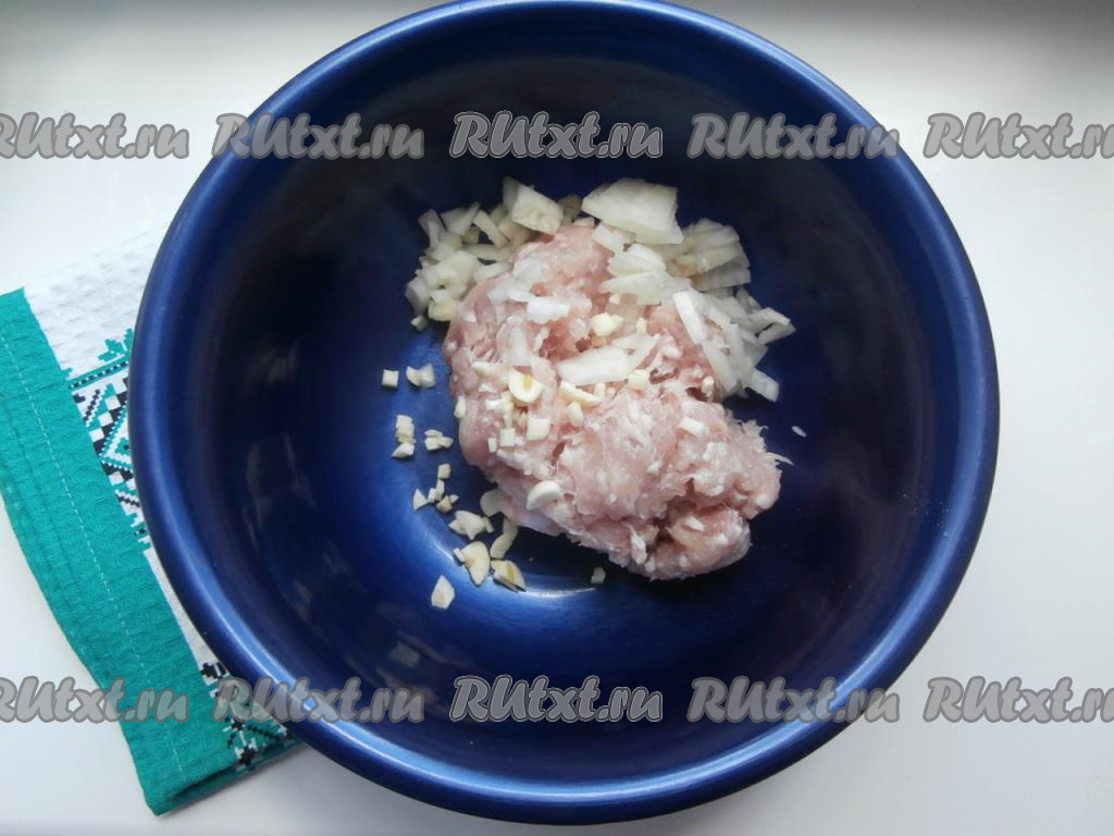 Вначале займёмся начинкой для наших ленивых беляшей. Для получения фарша нужно пропустить через мясорубку кусочки мяса (я взяла кусочки куриного мяса и свинины). Можно взять и покупной фарш. Луковицу и зубчик чеснока мелко нарезать, выложить к фаршу.