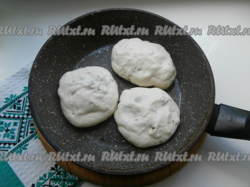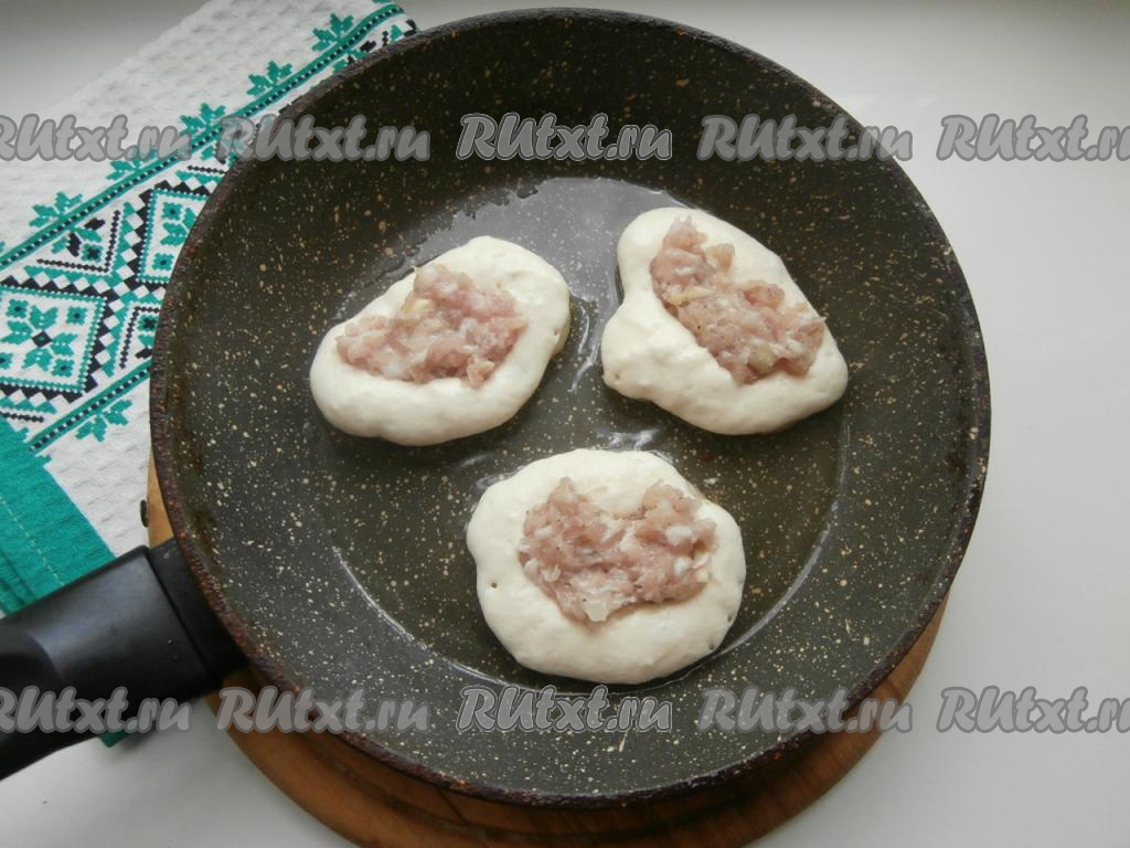 В сковороде хорошо прогреть растительное масло, затем выкладывать по 1 столовой ложке теста в виде оладий. В центр этих "оладий" выкладывать по 2 чайных ложки подготовленного фарша.