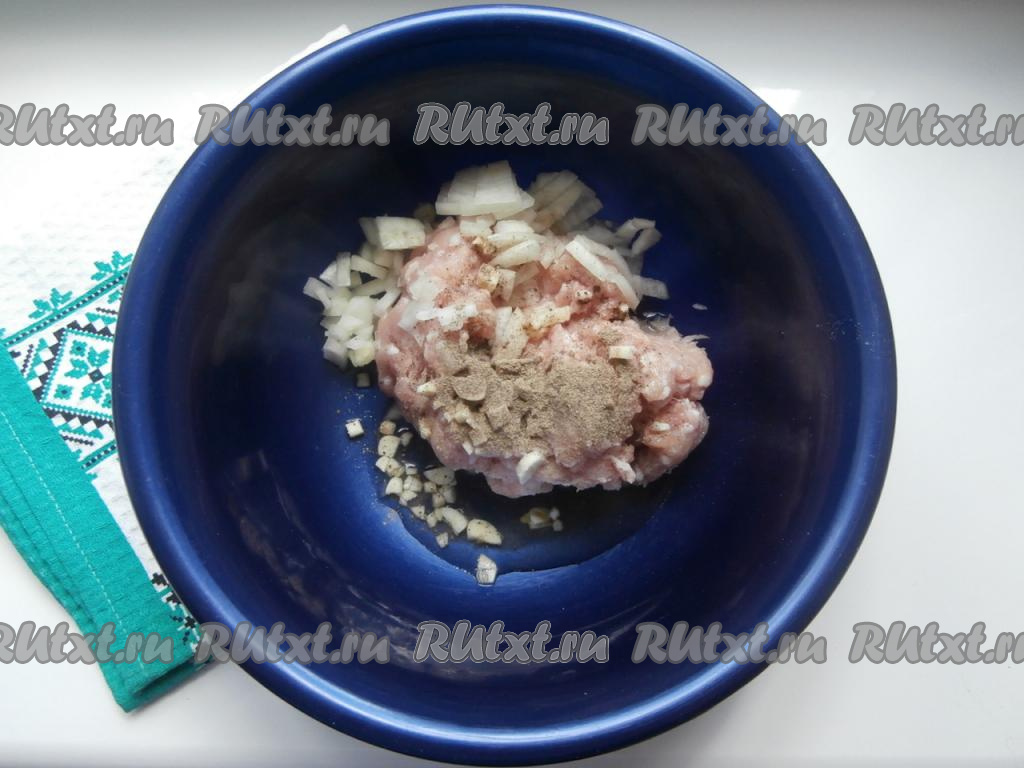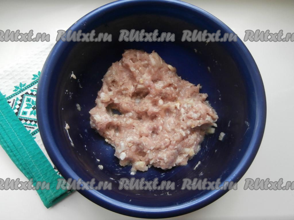 Посолить фарш, поперчить и влить к нему холодную воду.