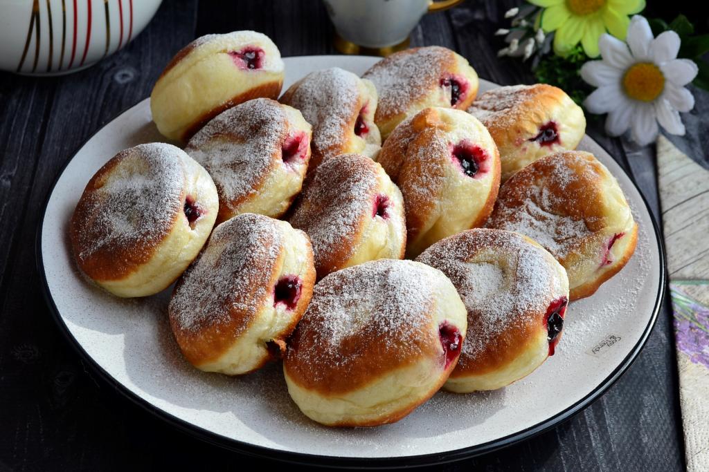 Пышные, очень вкусные пончики с вареньем можно подавать к чаю или с молоком.