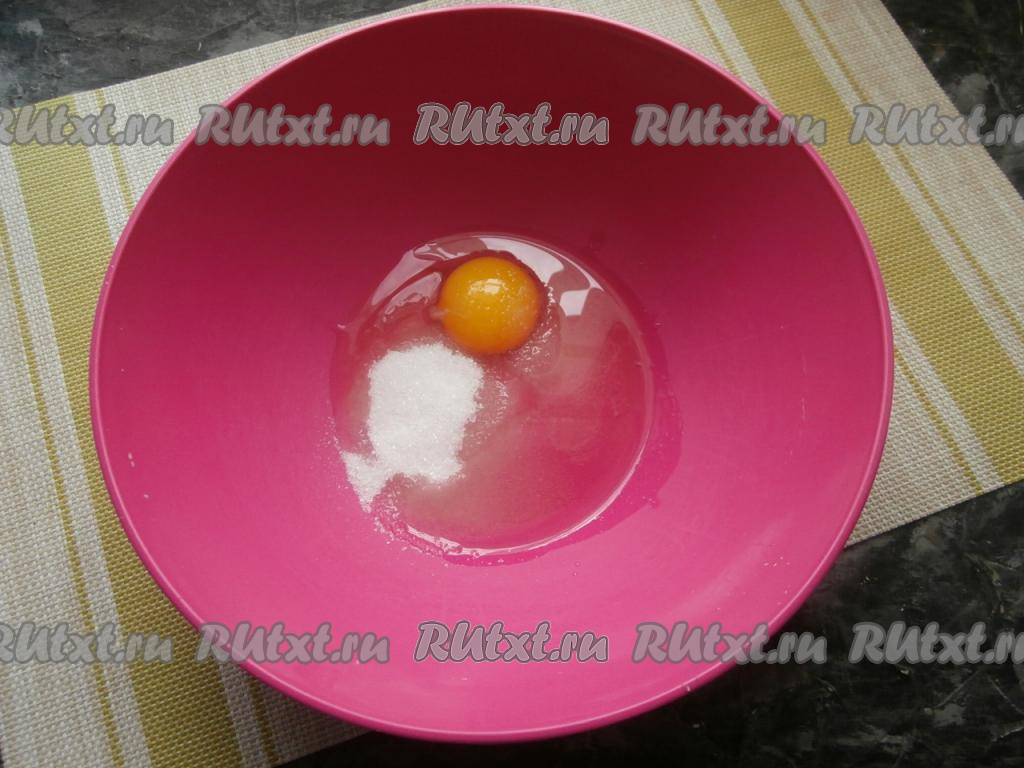 В отдельную миску разбить сырое яйцо, добавить сахар, соль и ванильный сахар.
