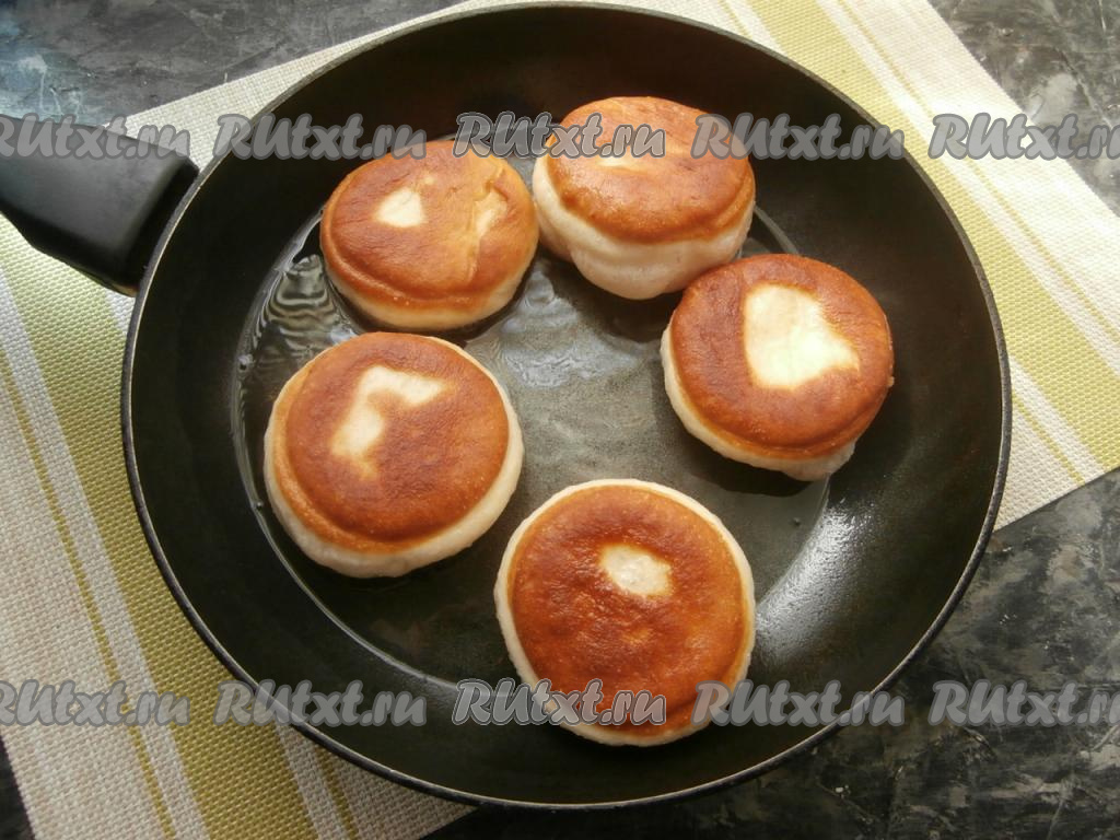 Жарить пончики на небольшом огне до румяности.