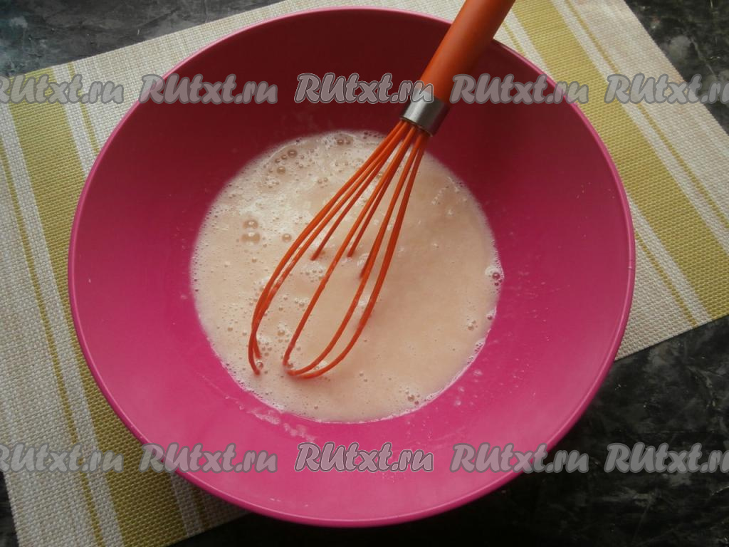 Расколотить содержимое миски венчиком, влить запенившуюся дрожжевую смесь и 2 столовые ложки растительного масла, перемешать.