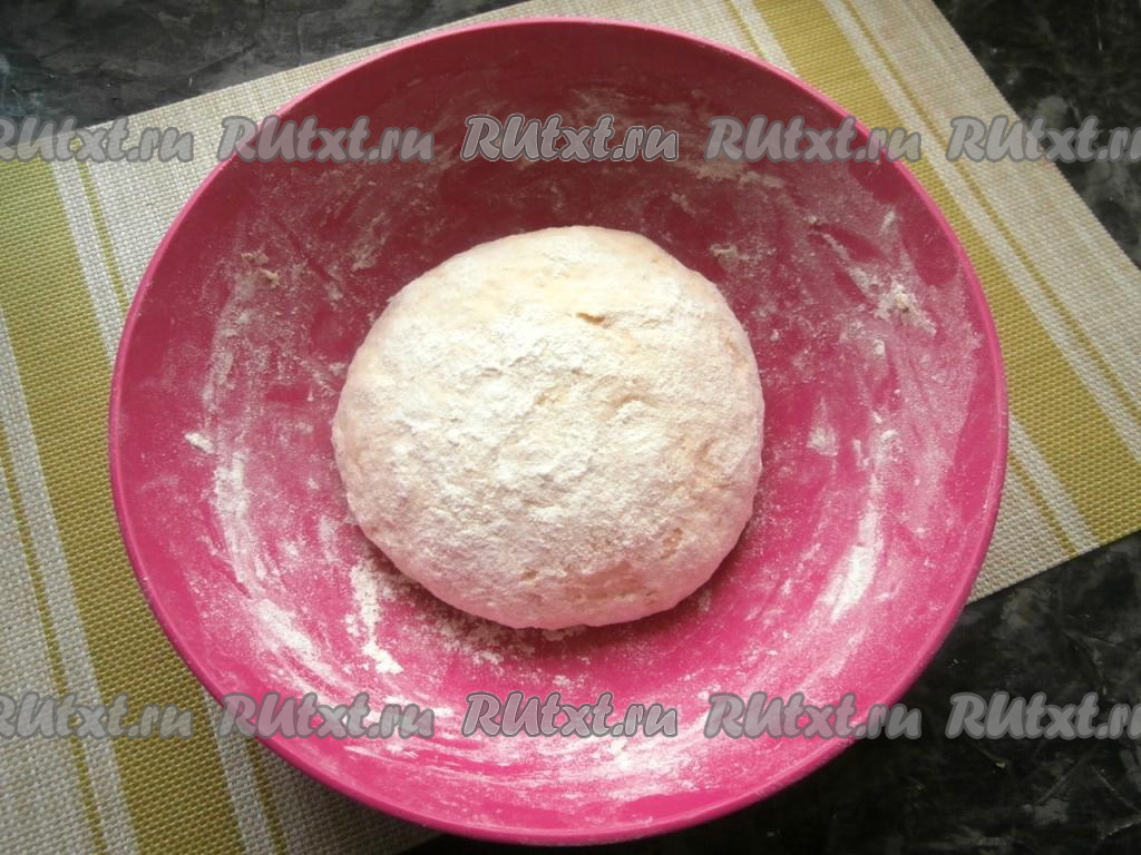 Перемешивать тесто сначала ложкой, а затем, подсыпая по мере необходимости муку, замесить руками достаточно мягкое, но не липкое тесто, которое прикрыть полотенцем и оставить в тёплом месте на 45 минут.