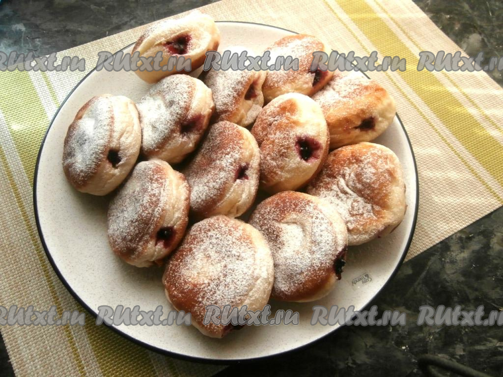 Далее сбоку в каждом пончике сделать дырочку (палочкой или трубочкой) и с помощью кондитерского мешка начинить пончики вареньем. Сверху посыпать сахарной пудрой.