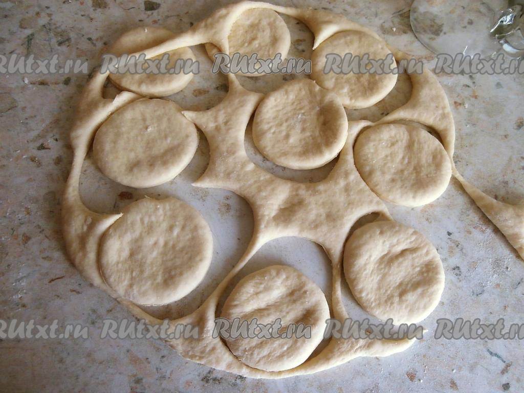 Далее тесто обмять, раскатать в лепёшку толщиной около 0,7 сантиметров. Стаканом вырезать кружочки - будущие пончики.
