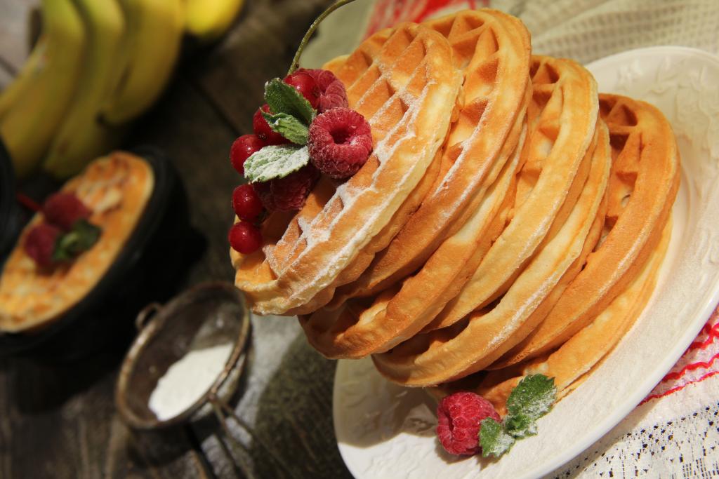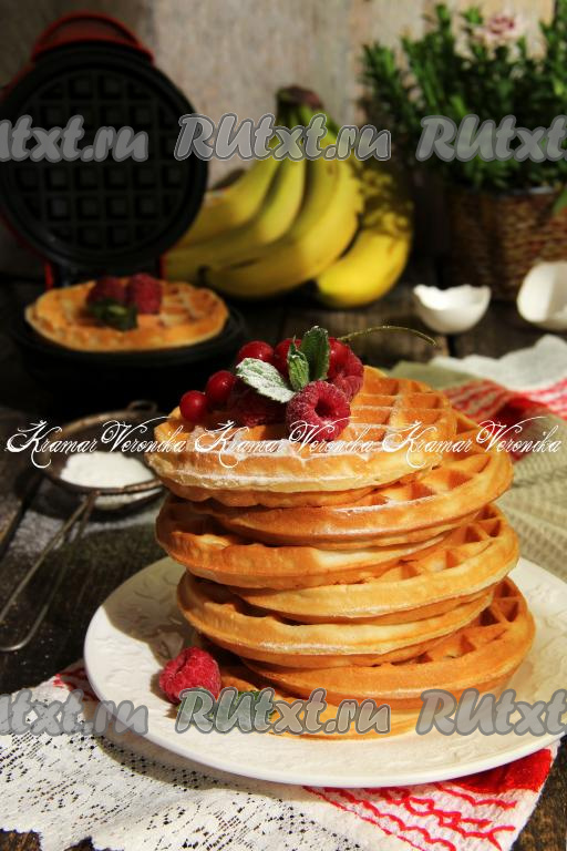 Готовые вафли подать к столу в тёплом виде, дополнив сгущёнкой, вареньем или просто присыпав их сахарной пудрой.
