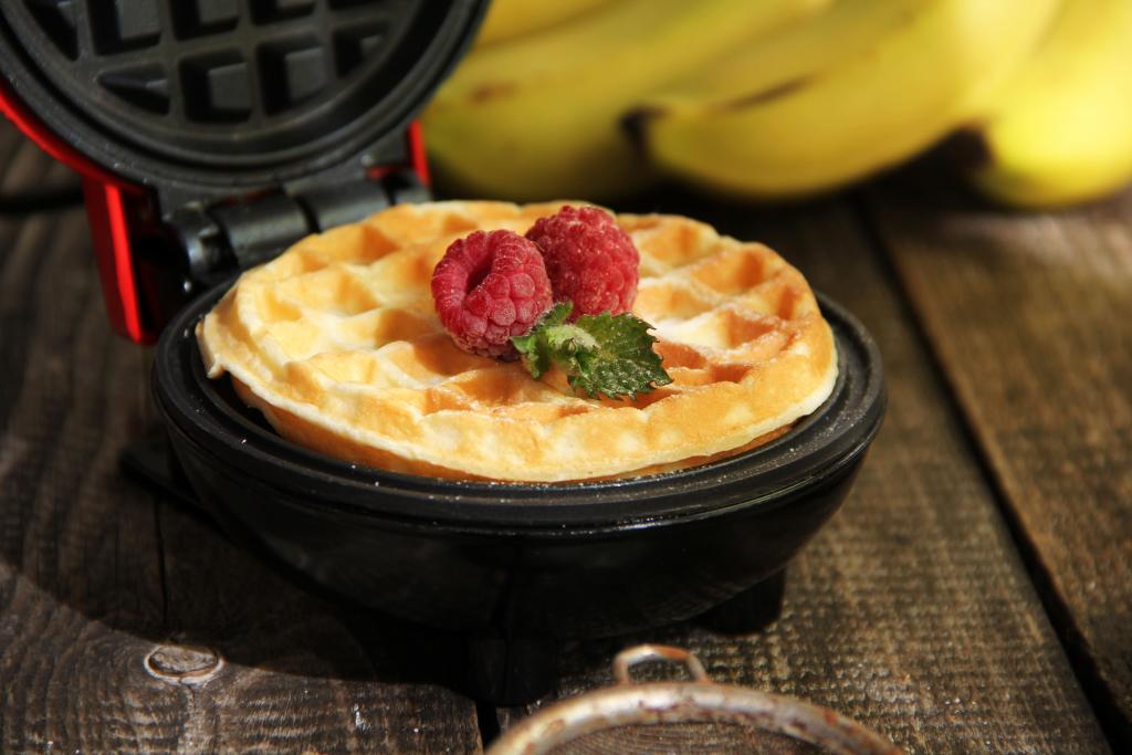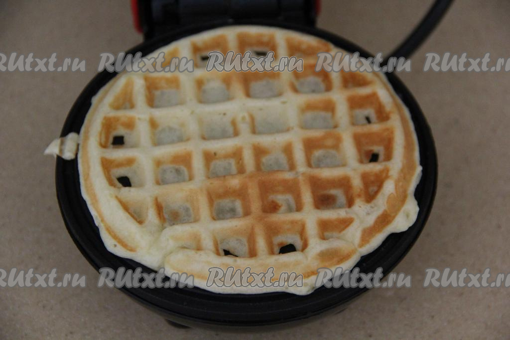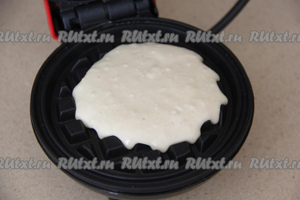 Электровафельницу хорошо разогреть, смазать створки маслом перед первой вафлей. Выложить 2 столовых ложки творожной массы (ориентируйтесь по размеру вашей вафельницы).