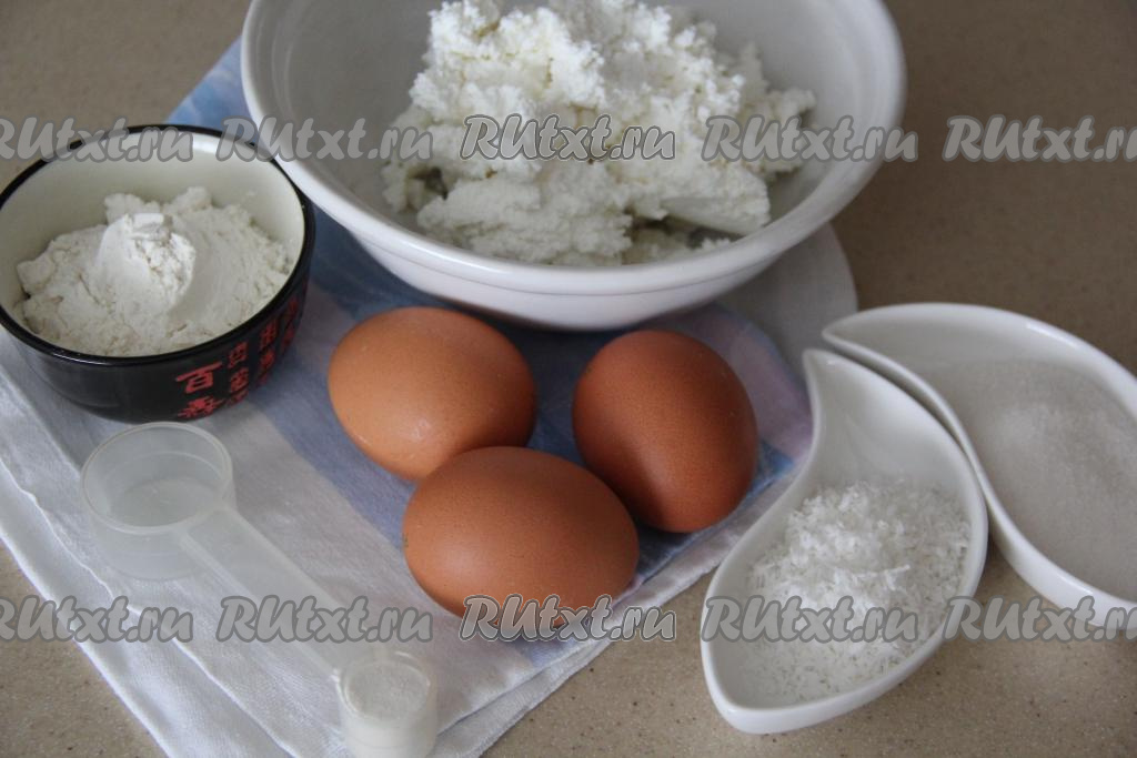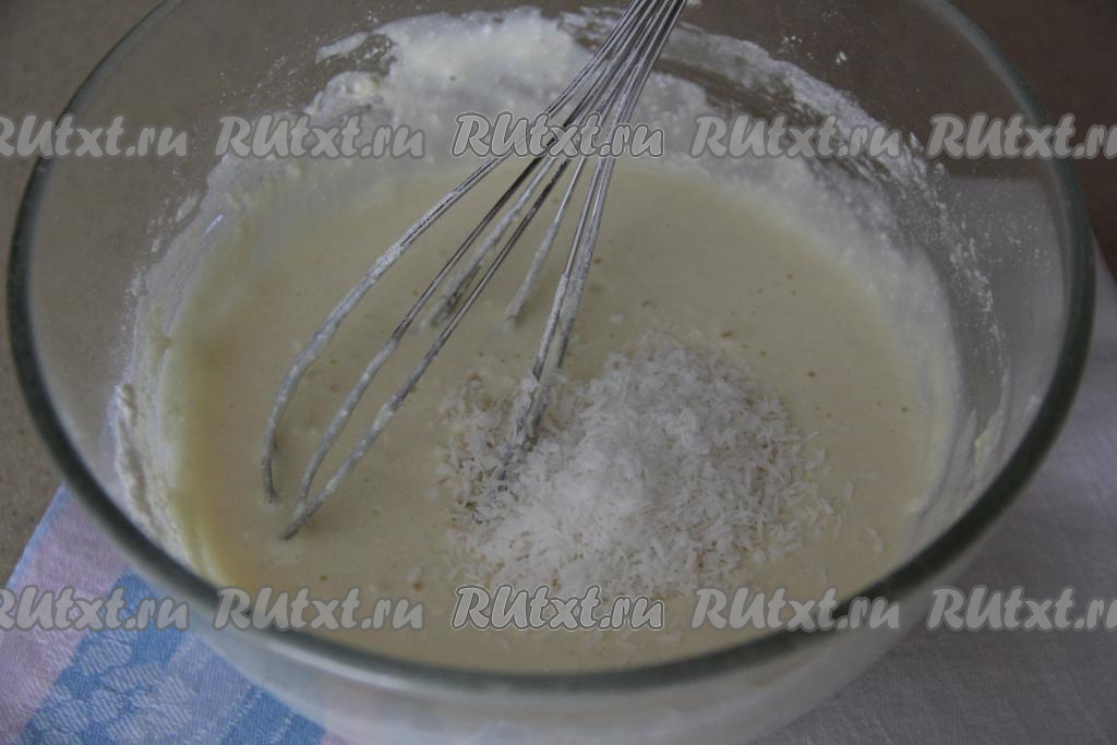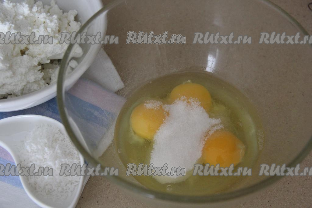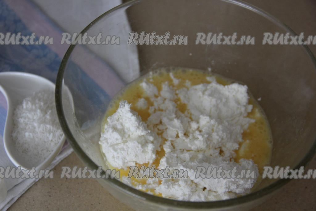 Если масса получилась жидковатой (многое зависит от величины яиц, влажности творога, наличии в тесте кокосовой стружки), тогда добавьте ещё немного муки, чтобы творожная масса стала нужной густоты.