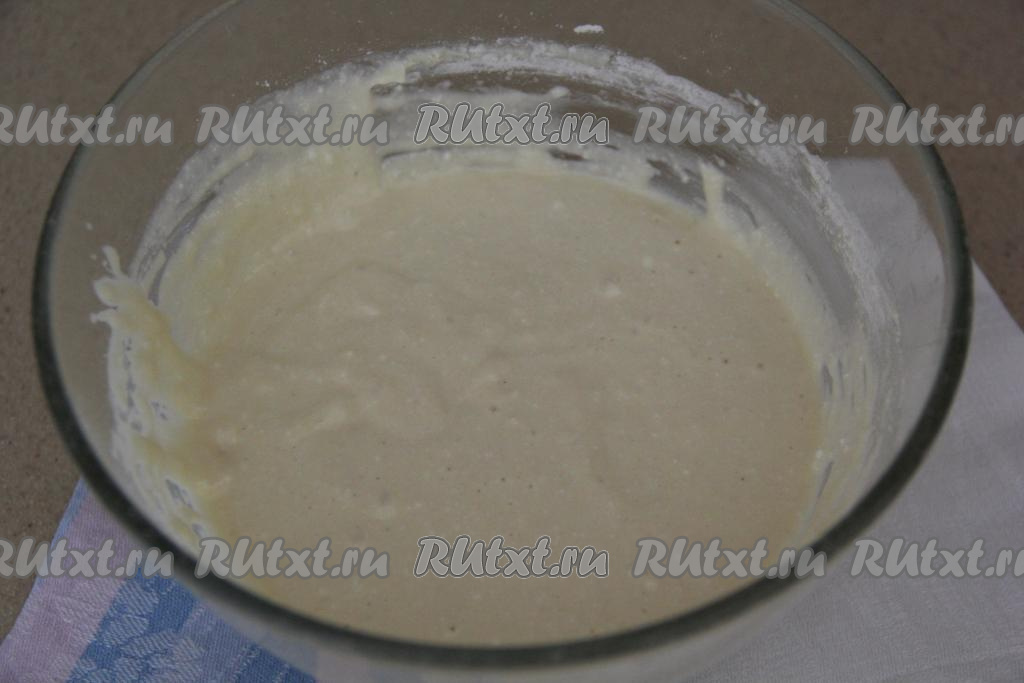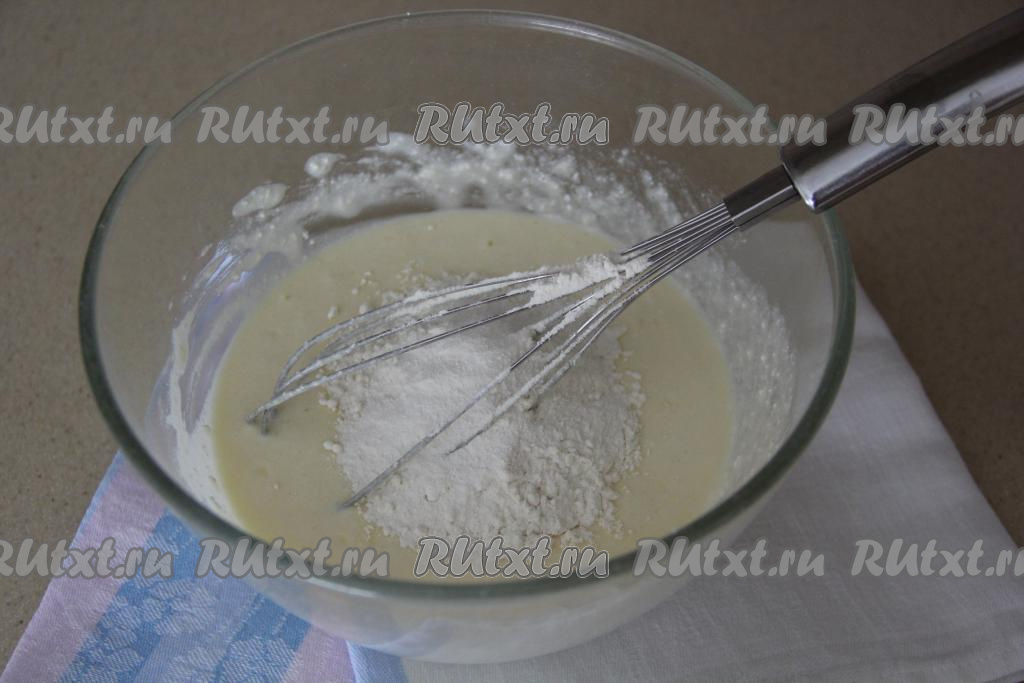 Хорошо перемешать массу венчиком. Всыпать разрыхлитель, частями добавить муку, перемешивая творожную массу венчиком до однородности.