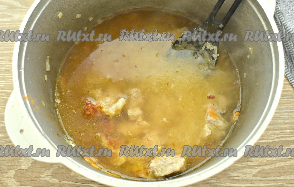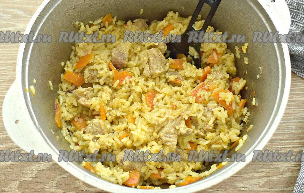 Доводим воду до кипения, накрываем казан (или сковороду) крышкой, убавляем огонь до минимального. Варим плов из пропаренного риса со свининой 30 минут.