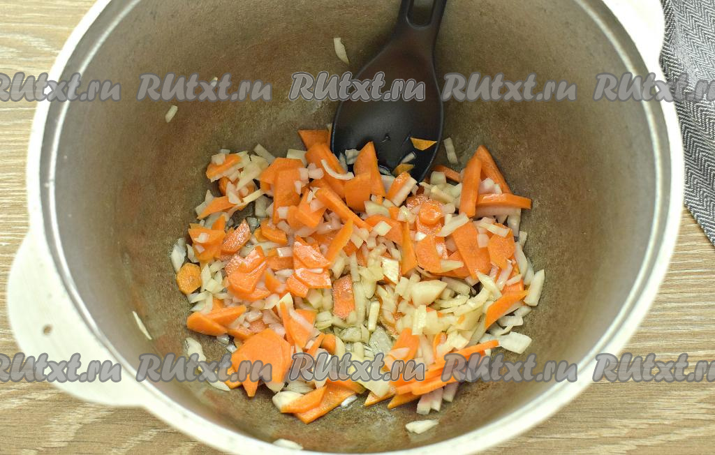 В казан (или глубокую сковороду) наливаем растительное масло, прогреваем его, затем выкладываем нарезанные морковку с луком. На среднем огне обжариваем морковку с луком 4-5 минуты, периодически перемешивая.