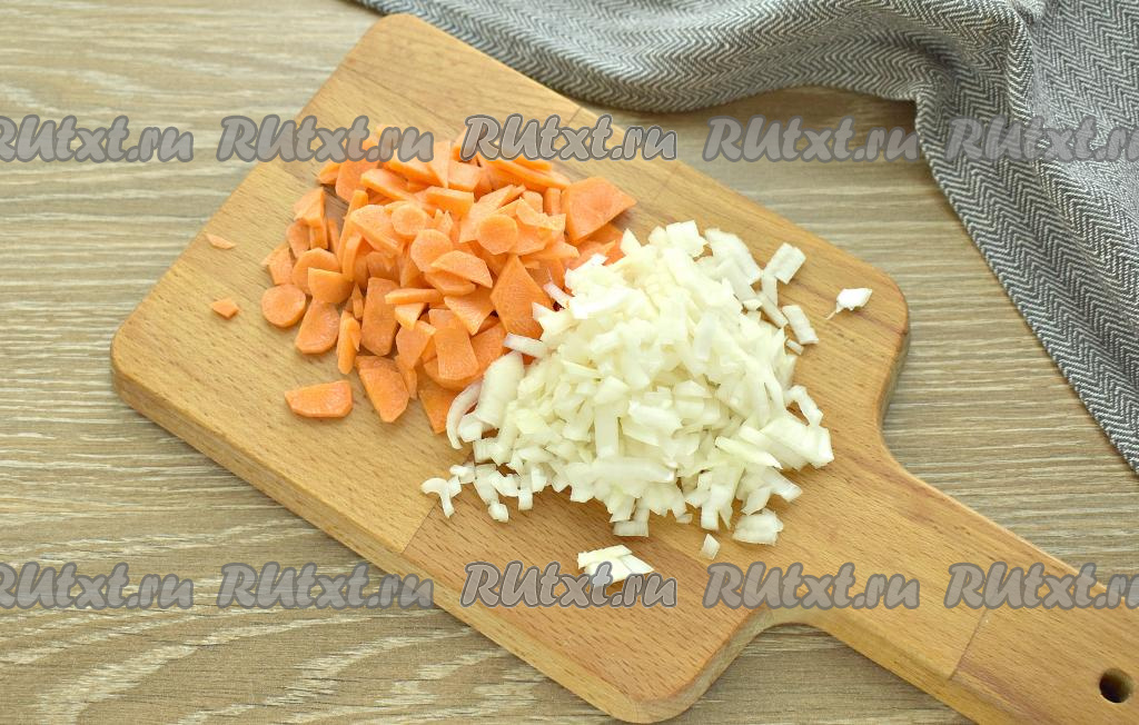 Очищаем морковку и лук. Нарезаем морковку с луком на маленькие кусочки.