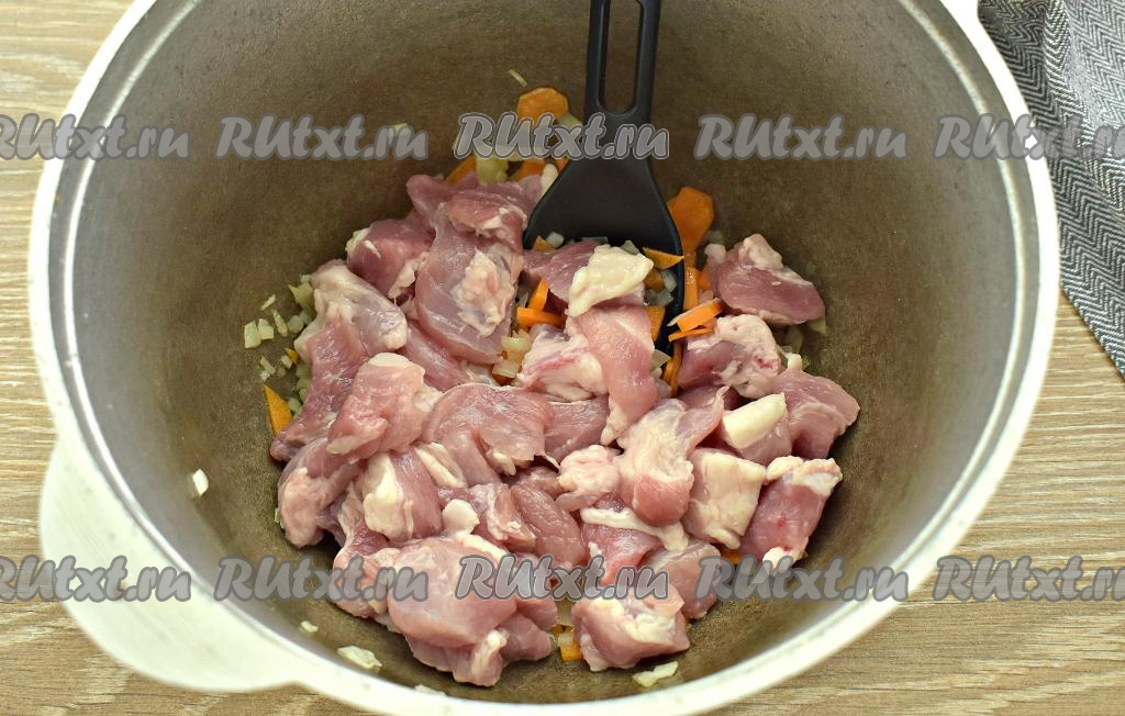 Добавляем кусочки свинины, перемешиваем и обжариваем мясо с овощами минут 8-10, помешивая.