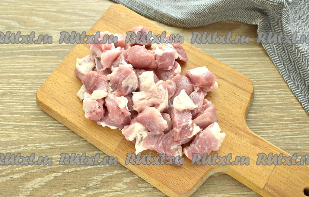 Промываем свинину (у меня была свинина с жировыми прослойками), обсушиваем и нарезаем её на небольшие кусочки.