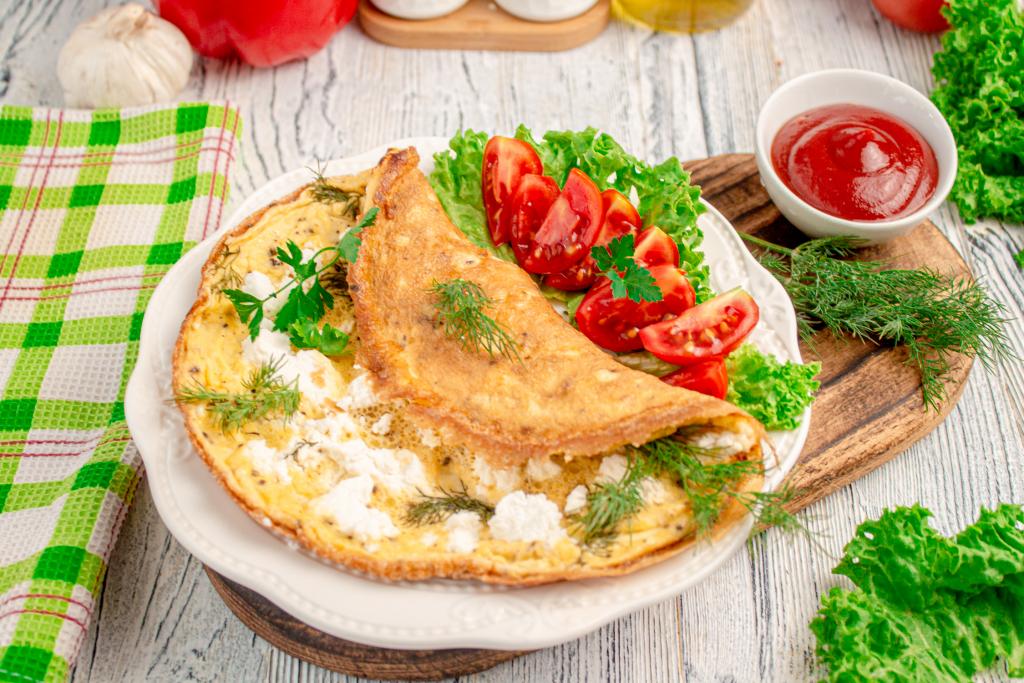 Вкусный, сытный омлет с рикоттой сразу подавайте к столу.