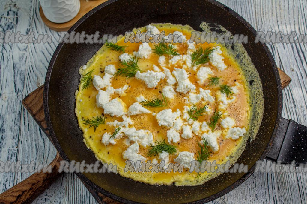 Снимите сковороду с плиты, верх омлета должен быть ещё слегка жидким. Раскрошите сыр "Рикотта", равномерно распределяя его по поверхности омлета, разложите веточки (или мелко нарезанную зелень) укропа. Сковороду накройте крышкой, верните её на плиту и готовьте омлет на минимальном огне.